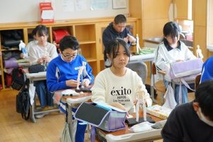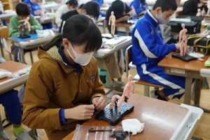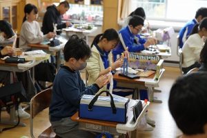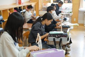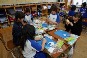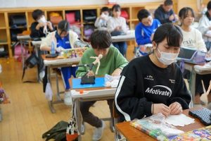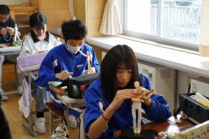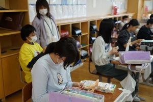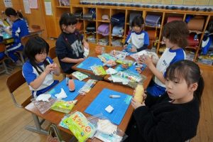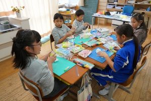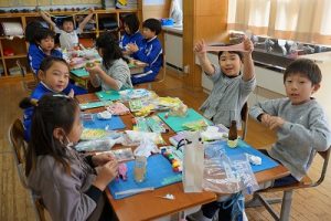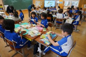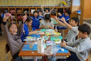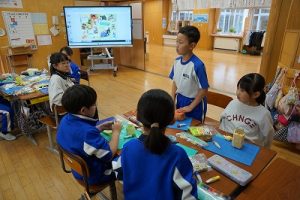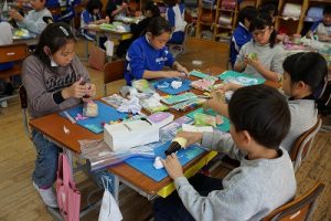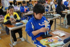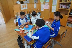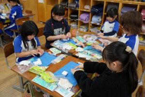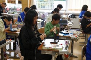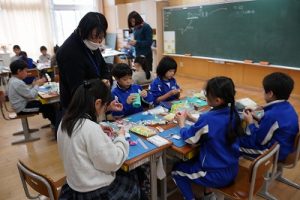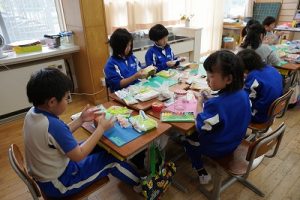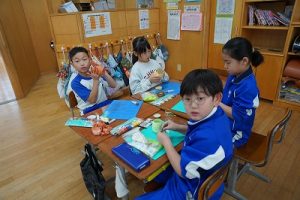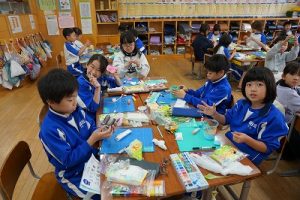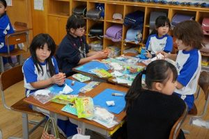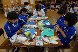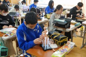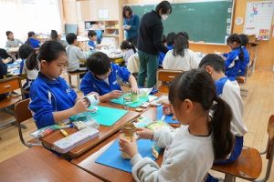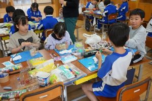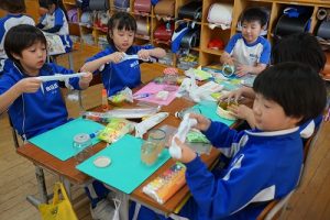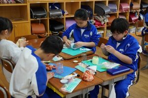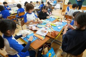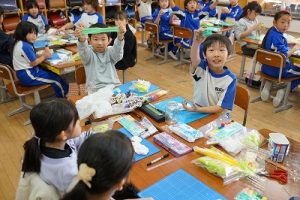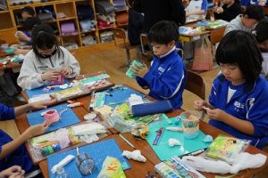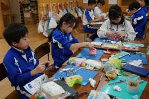 3年生の図画工作科では、空き容器に紙粘土を貼り付けて、ペン立てや小物入れ等を製作していました。やわらかく伸びる粘土を使っていて、とても楽しそうでした。