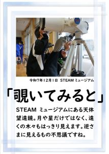 今日から12月です。11月の特別展示クイズ(化石を古い順に並べるクイズ)の正解者は2名でした。今月の特別展示は、クイズではなく、「振り子のマジック」を展示しました。早速挑戦している子どももいました。