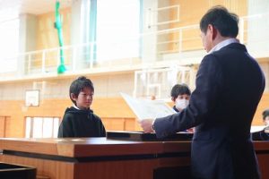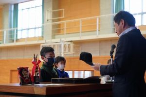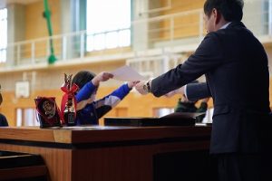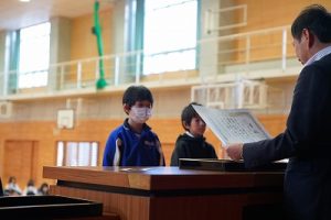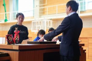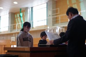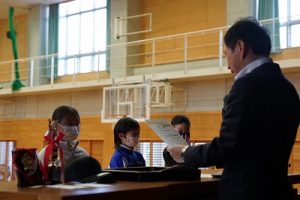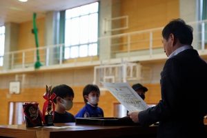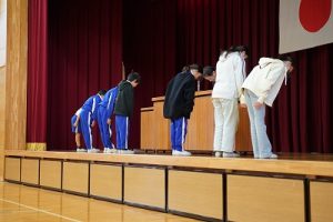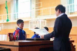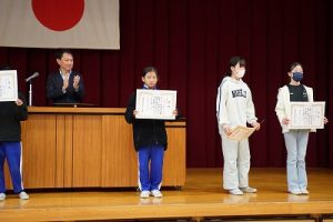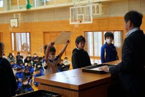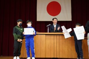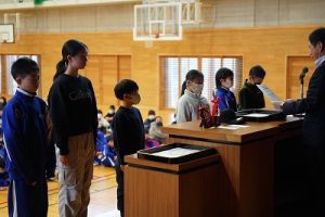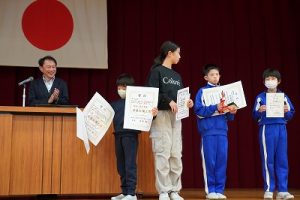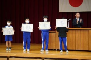 授賞集会の様子です。水泳、キックボクシング、空手、標語、そして先日行われた校区児童クラブなわとび・卓球大会の学年ごとの優勝者へ授賞を行いました。様々な分野で活躍していますね。