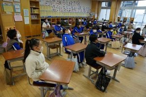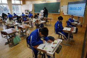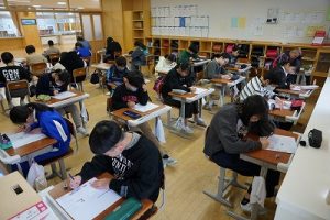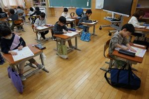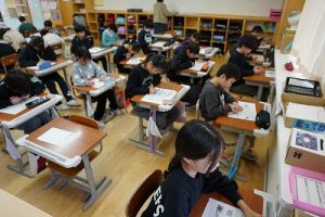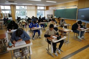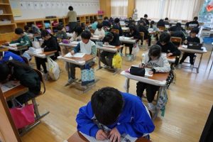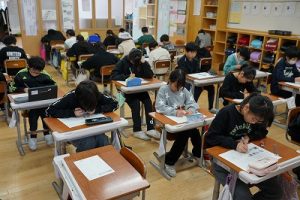 1校時の様子です。4つの学年でテストを行っていました。学期末で、まとめの時期に入っています。テスト「も」、頑張ってほしいですね。