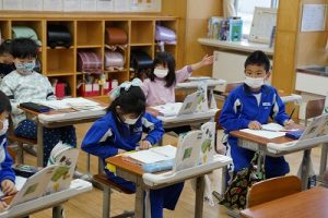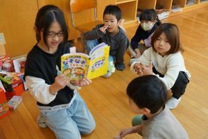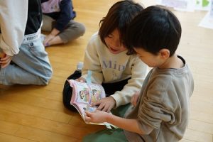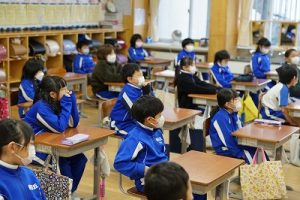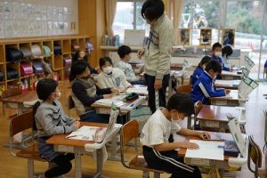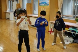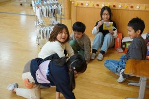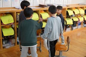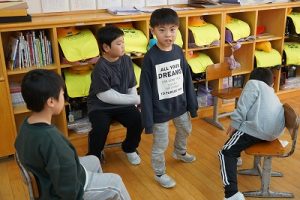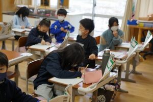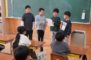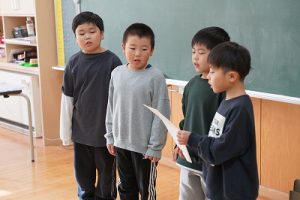1年生は、ユニークな係があります。それぞれの係に分かれて活動しているところに行くと、クイズを出してくれました。「王様が自然の中で楽しんでいます。何をしているでしょう?」難しいですね。教室では、フルーツバスケットの説明をしていました。実際にやって見せています。工夫して頑張っていますね。