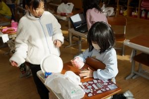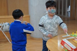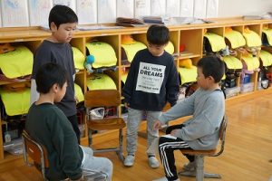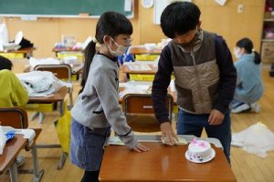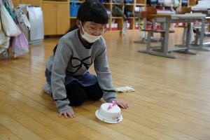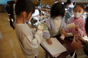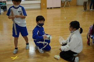 2年生は、生活科の時間に動くおもちゃを作っています。今日は、出来上がったおもちゃを試している子どもがたくさんいました。とても楽しそうでした。