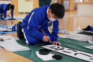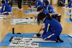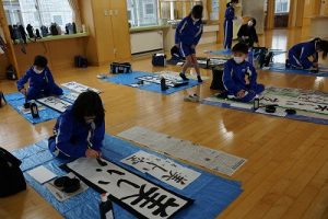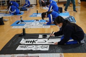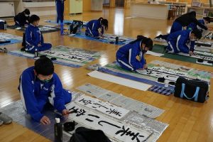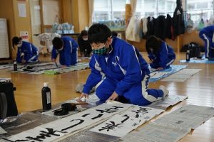 6年生の書初練習の様子です。写真は、授業の終わり頃ですので、聖書が終わった人から片付けを始めてます。そのようなときでも、最後まで集中力を切らさずに頑張っていて素晴らしいです。