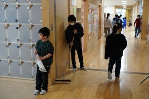 インフルエンザの流行が落ち着いてきたことから、今日から、学年割り清掃から縦割り清掃と変更しました。縦割り活動を行うことで、上級生は下級生を思いやる気持ちやリーダーシップが育ちます。コミュニケーション能力が高まったり、協力し合うことの大切さも学ぶことでしょう。ただし、感染症について油断してはいけませんので、マスクをして清掃をすることを推奨しています。ご家庭でも、マスク持参のご協力をお願いします。