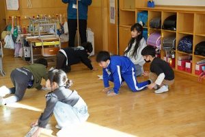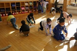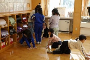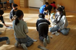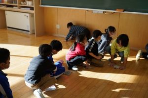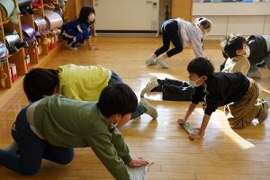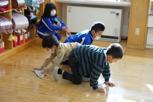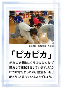 学期末を迎え、それぞれの学年では、様々な場所の大掃除を行っています。2年生は、全員で床のぞうきんがけをしていました。本当にピカピカになりました。協力して頑張りましたね。