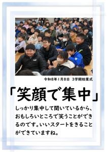 3学期の始業式が行われました。「2026年は、みなさんにとっても、みなさんの家族にとっても、とても充実した年になるでしょう。それから、今日から3学期ですが、みなさんはこれまで以上に勉強も運動も頑張ることでしょう。また友達ともますます仲良くなることでしょう。」という『予言』を行いました。その後、生徒指導の話、人権の話が行われました。3学期、元気にスタートしました。