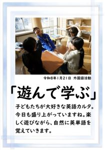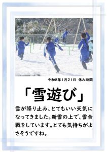 おはようございます。昨日の「大寒」に合わせるように雪が降ってきましたね。今朝も路面に雪が積もっています。どうぞお気をつけ下さい。休み時間は雪遊びを楽しむ子どもが多いかもしれません。本日も、どうぞよろしくお願いします。