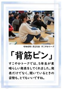 5年生の学習参観は、学校医の先生方を講師として迎え、「すこやかトーク」を行いました。「すこやかトーク」は、学校保健委員会の一つとして、20年以上前から行われているものです。毎年、子供たちが自分のテーマを決めて追究したことに対して、学校医の先生方にアドバイスをいただいています。自分たちの生活習慣等について見直すことができるとてもよい機会になったと思います。学校医の先生方には、協力授業もしていただいており、本当にお世話になっております。