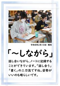 おはようございます。今週も2日目ですが、明日は「建国記念の日」のため、休みとなります。ちょうどいい中休みになりますね。ところで、祝日には、「の」が入る日と入らない日がありますね。(「の」が入る祝日の例:建国記念の日、文化の日)、「の」が入らない祝日の例:天皇誕生日、憲法記念日)AIに聞いたら、その理由をすぐに答えてくれます。だとすれば、答えを知ることよりも、「どうしてそうなのかな?」と疑問を持つことの方が大切なのかもしれませんね。今日も、子供たちが「疑問」をもち、「興味・関心」を高め、「調べてみたい」と思える場面が多くあることを願っています。