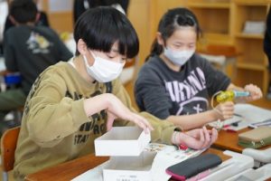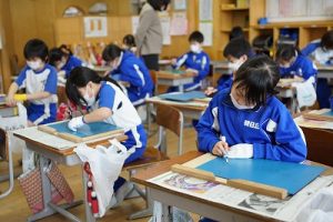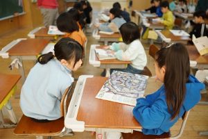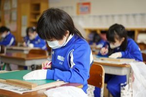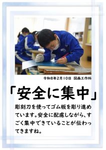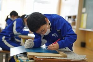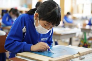 3年生が図画工作科の時間に製作している版画は、「ゴム版画」です。安全に配慮しながら、慎重に掘り進めていました。集中している様子が伝わりますね。