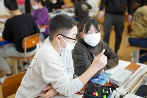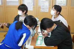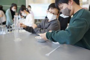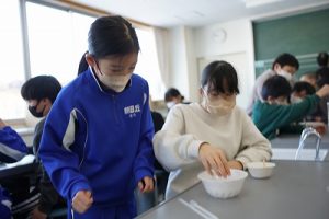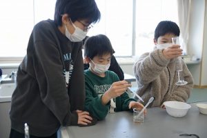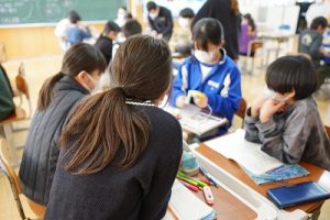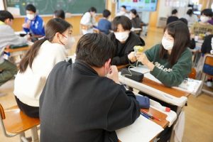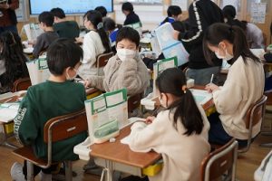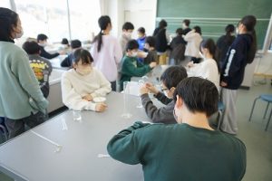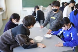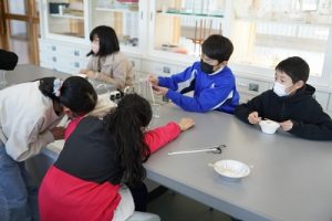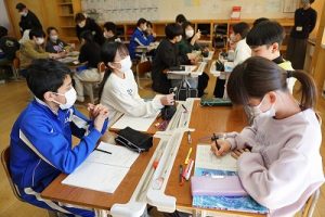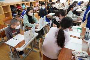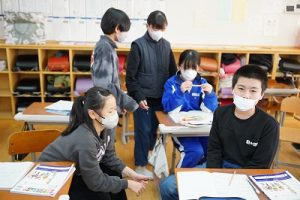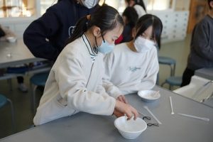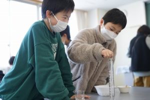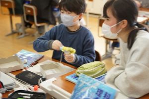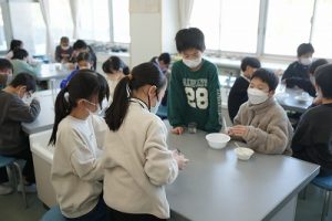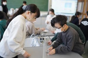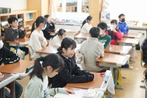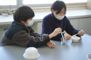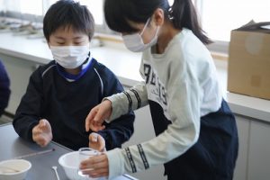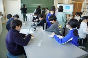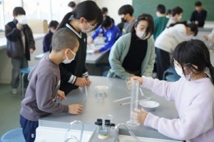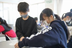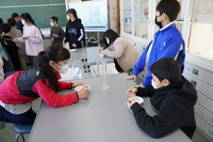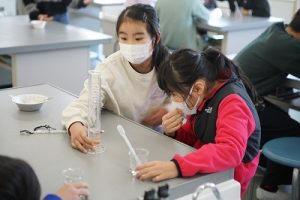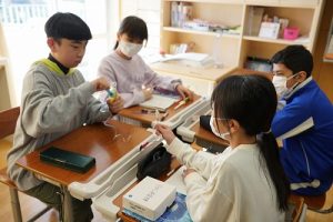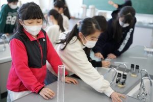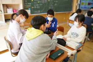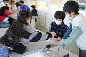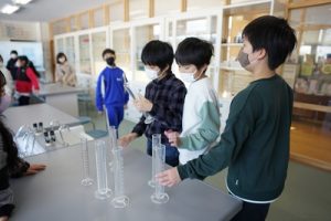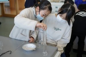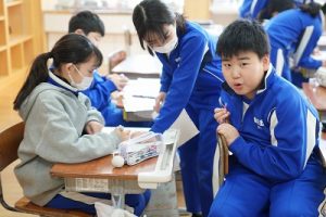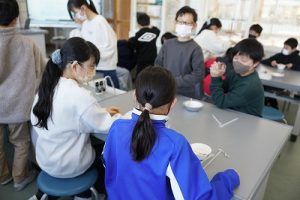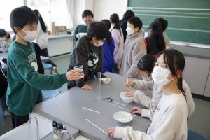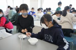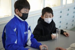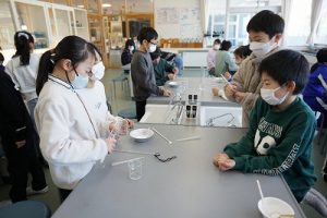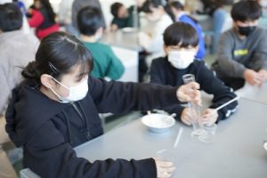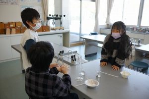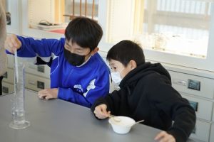5年生の理科では、「水の温度を上げると、食塩やミョウバンのとける量は増えるか」について調べていました。説明をしっかりと聞き、協力し合って、楽しそうに実験しています。学習に向かう姿勢がとてもいいですね。
