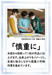 5年生の図画工作科では、木版画の印刷を行いました。1枚の版木を4回に分けて印刷し、一つの作品に仕上げます。同じ色で統一したり、違う色で変化を加えたりと、出来上がりをイメージしながら進めていました。