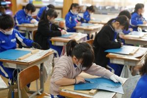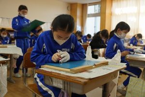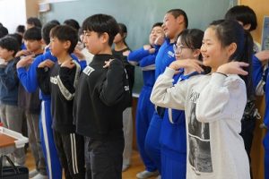 6年生は、こども園や福祉施設に千羽鶴とビデオメッセージを届けようと準備を進めてきました。今日は、「幸せなら手をたたこう」の歌を大合唱しているところをビデオ撮影しました。元気を届けることができると思います。