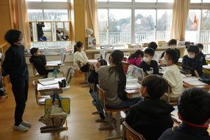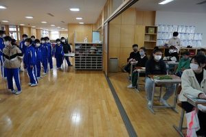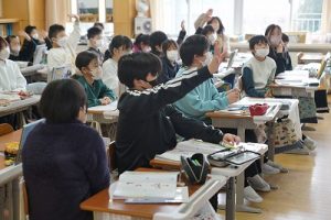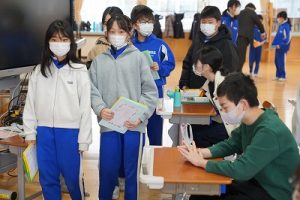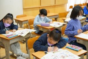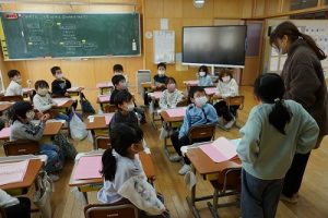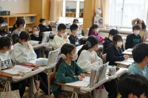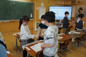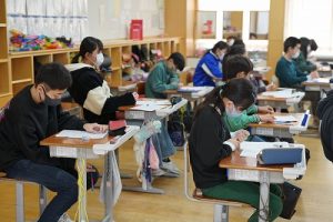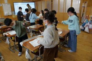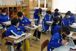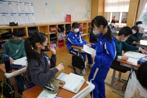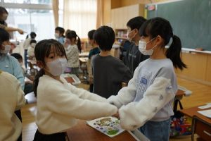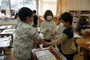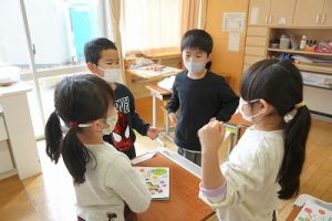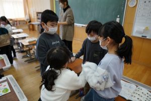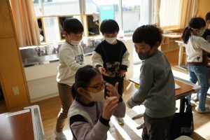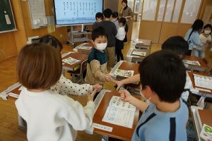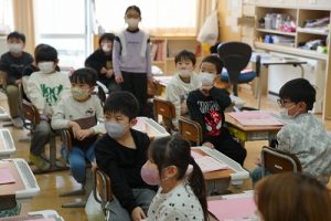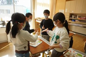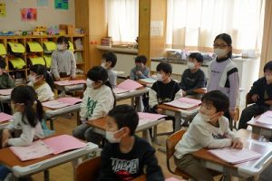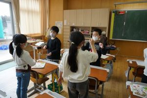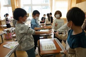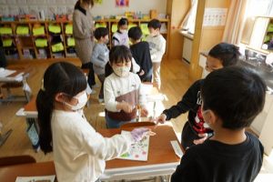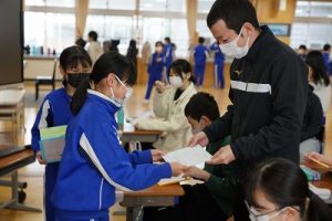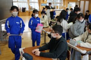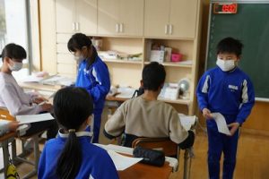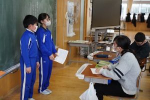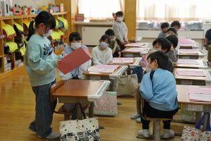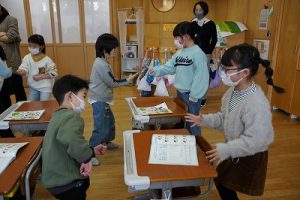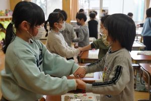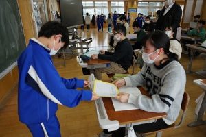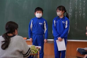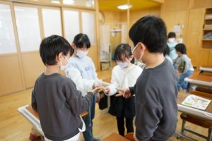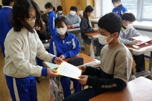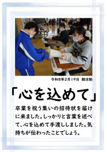 卒業を祝う集いに向けて、各学年では様々な準備が進められています。朝活動の時間には、3年生がアンケートの回収に来ていました。将来なりたい職業について聞いていたようです。4年生は、祝う集いの招待状を届けに来てくれました。心を込めて渡していました。