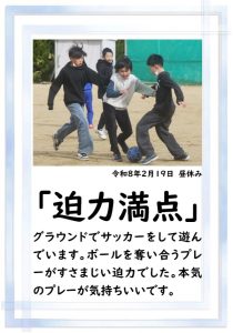 今朝は、グラウンドに雪が積もって真っ白になっていました。それがあっという間に溶けてなくなりました。朝、書いた「グラウンドも真っ白で、今日は子供たちが大好きなサッカーは出来そうもありません。」は、訂正させていただきます。昼休みも太陽が出て暖かく、グラウンドやプレイグラウンドで遊ぶ子どもたちがたくさんいました。元気な子どもたちから元気をもらっています。