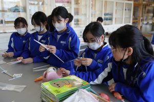 6年生の図画工作科では、スチレン版画の印刷を行っていました。何色かのインクを使って、色の変化を楽しみました。彫った模様がきれいに浮かび上がってすごくきれいな作品になりました。