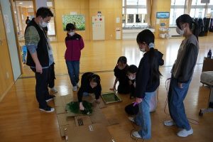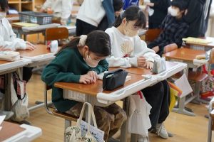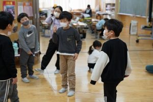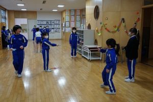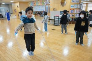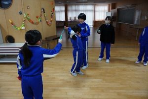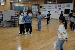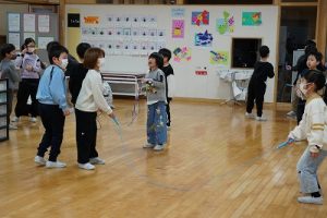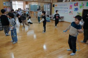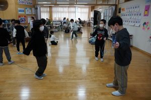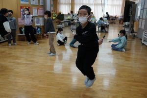 始業前の様子です。朝から縄跳びをしている子どもがたくさんいます。縄跳びカードを使って出来る技を増やそうと練習したり、大縄を楽しんだりしています。「こんな技ができるよ」と見せてくれた子どももいます。本当に元気いっぱいですね。5年生は、卒業を祝う集いの準備を進めているグループもありました。頑張っていますね。