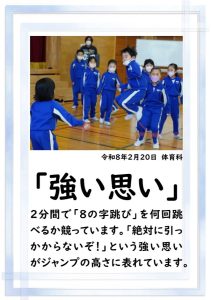 2年生の体育科では、赤団と白団の対抗戦で、2分間で何回「8の字跳び」をできるかの競争をしていました。縄跳び集会が中止となりましたので、各学年での記録を取っている意味もあるのでしょう。応援し合いながら頑張っていました。