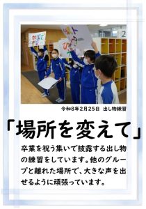 5年生が、明日の「卒業を祝う集い」のリハーサルを行っていました。飾り付けの係の人たちは、全体のバランスを考えながら飾り付けを行っていました。進行や挨拶、出し物もずいぶん上手になってきました。明日は、素晴らしい集いになることでしょう。