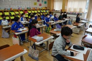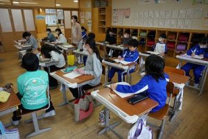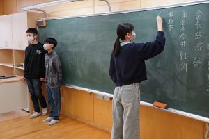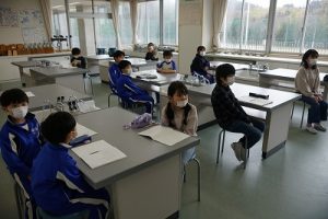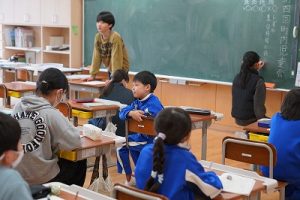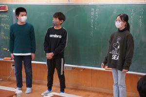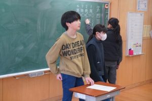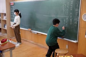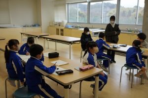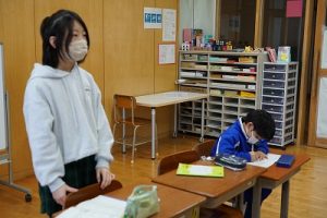 1校時の様子です。1・3年生は卒業を祝う集いの練習をしていました。2・5年生は算数、4年生は外国語活動、6年生はテスト直しを頑張っていました。