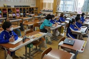 6年生の外国語科の学習では、比美乃江小学校の6年生と一緒に遠隔合同授業を行いました。遠隔合同授業とは、ICTを利用して異なる場所にある学校の教室同士をつなぎ、両校の児童生徒が共に学ぶ授業のことです。両校が、小学校時代の思い出等を英語で発表し合いました。授業時刻を合わせるために、休み時間からのスタートでしたので、5年生も見に来ていました。