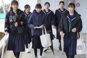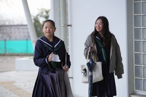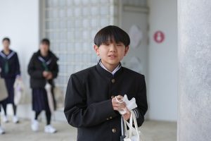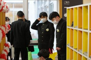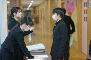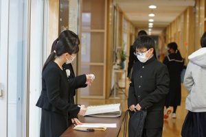 卒業生が登校し、受付でコサージュを付けてもらいました。いよいよ、卒業証書授与式が始まります。