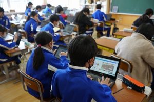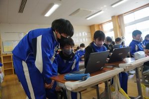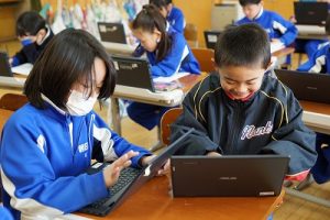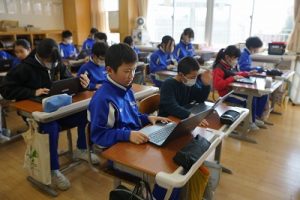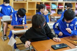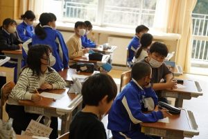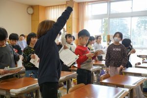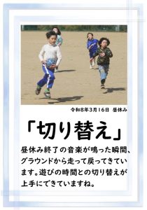 朝日丘小学校のチャイムは「キーン コーン カーン コーン」ではなく、音楽が流れます。昼休みの終了の音楽が流れると同時に、グラウンドにいた子供たちが走って戻ってきました。戻るときも元気いっぱいですね。