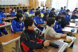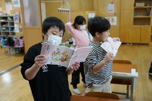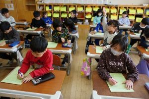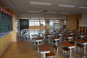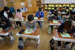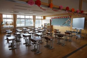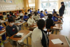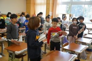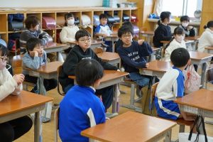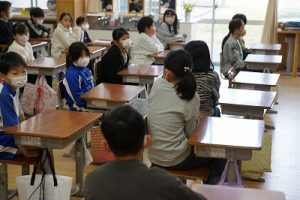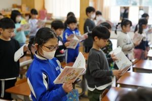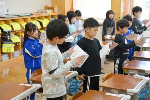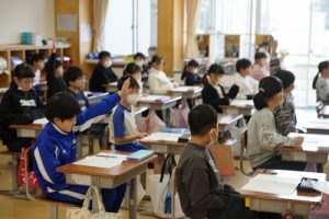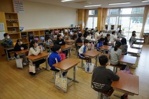 朝活動の様子です。1年生は、しりとり遊びの音読を行っていました。6年生教室には、当たり前ですが誰もいません。お祝いの飾りが寂しさをいっそう感じさせてくれます。