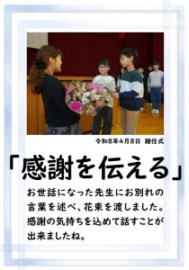 異動された5名の先生方の離任式が行われました。代表の子どもたちが、お礼の言葉を述べ、花束を渡しました。5名の先生方にはたいへんお世話になりました。新天地でも頑張っていただきたく思います。本当にありがとうございました。