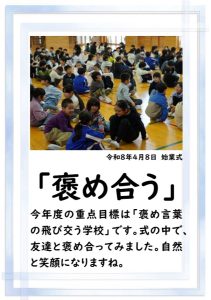 今年度も本校では、子どもたちが「学校が楽しい」「明日もまた来たい」と思えるように、教職員一同、全力で取り組んでまいります。保護者の皆様、地域の皆様、今年度も温かいご支援とご協力を賜りますよう、心よりお願い申し上げます。