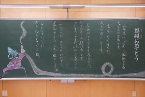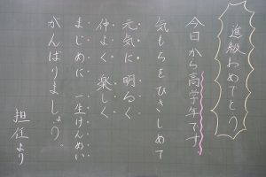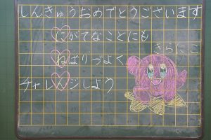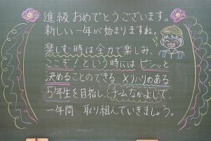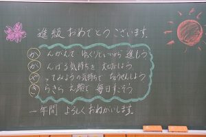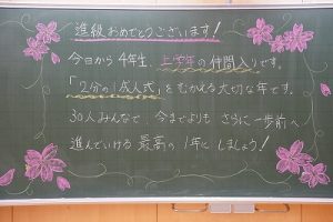 いよいよ令和8年度がスタートします。黒板には、新しい担任がメッセージを書いて子供たちを迎え入れます。1年間、みんなで頑張りましょう。