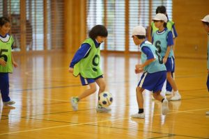 体育館から元気な声が聞こえてきたので行ってみると、4年生が、室内サッカーをしていました。今日は、体育館全体を使ってのゲーム(試合)を行っていました。見ているときの態度がとてもよく、大きな声で応援していました。
