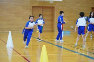 フラッグフットボールとは、アメリカンフットボールで行われる「タックル」を、プレーヤーの腰の左右につけた「フラッグ」を取ることに置きかえたスポーツです。5年生は、フラッグフットボールの導入段階として、まずは楽しく、「ボール運び鬼」からスタートしていました。