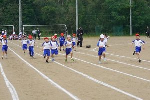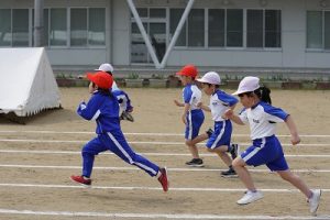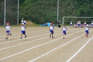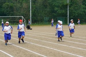 短距離走の様子です。1・2年生は80m、3~6年生は100mを走ります。放送、決勝、記録等の係活動も頑張っていました。