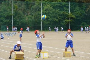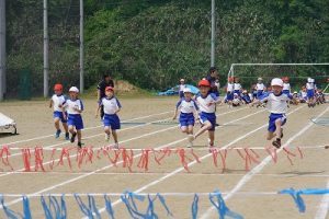 障害物走の様子です。それぞれの学年で、障害物が異なっています。用具係が一生懸命準備をしてくれていました。