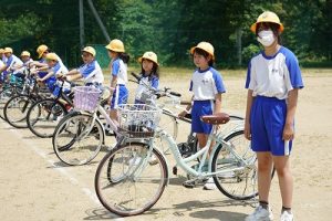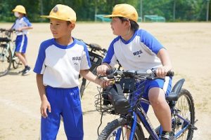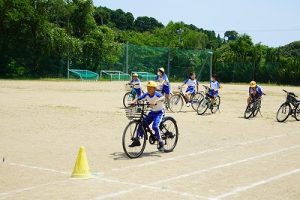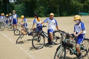 4年生の自転車練習では、信号のある交差点の渡り方を学習していました。動きの意味を考えながら練習してほしいと思います。