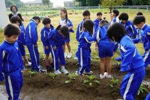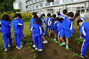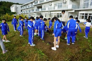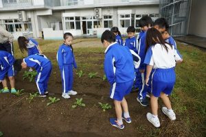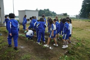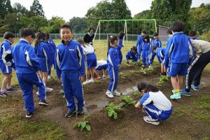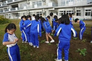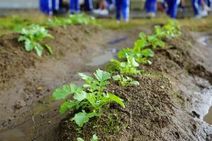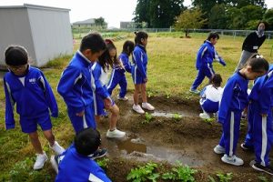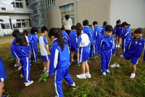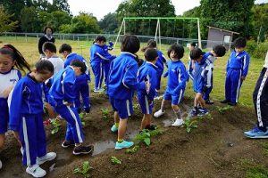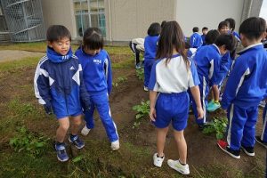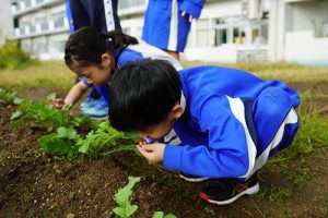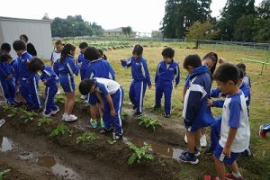 2年生が植えた大根が大きく育ってきました。大きな葉っぱのにおいを嗅いでいる子供もいました。収穫が楽しみですね。