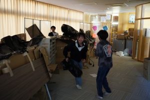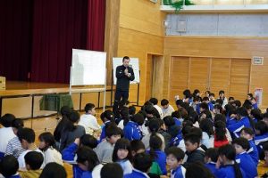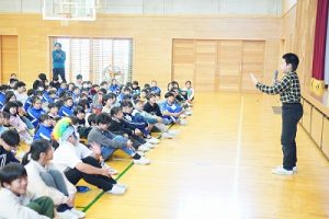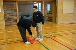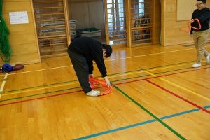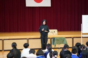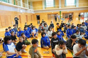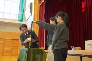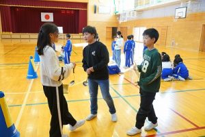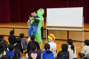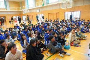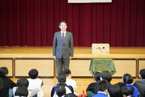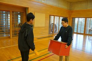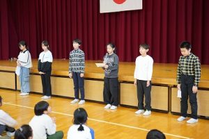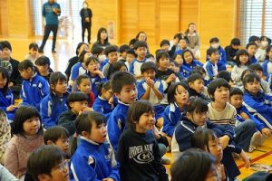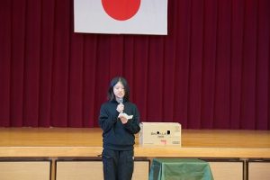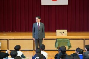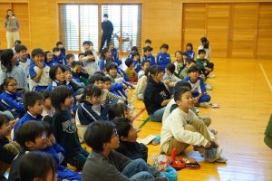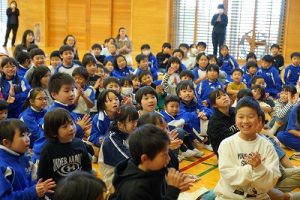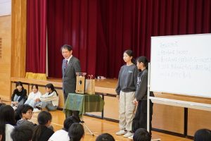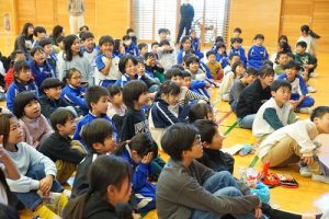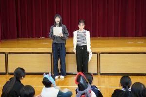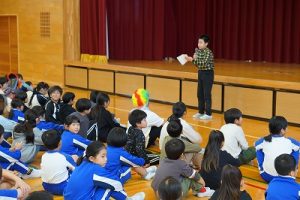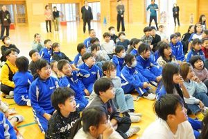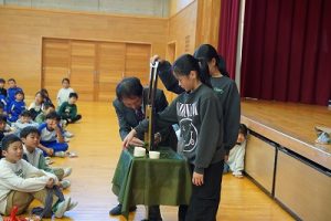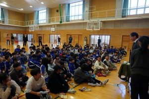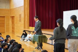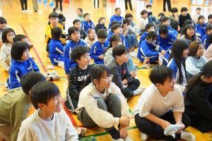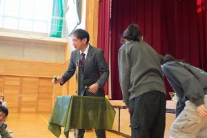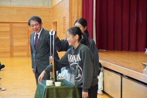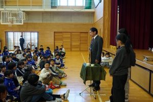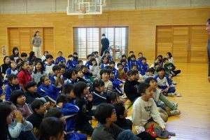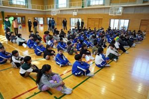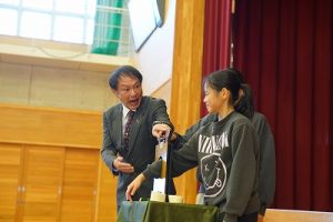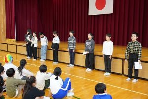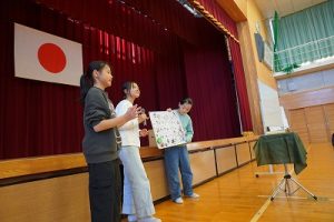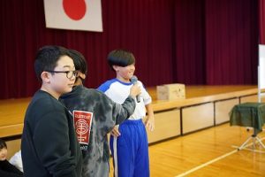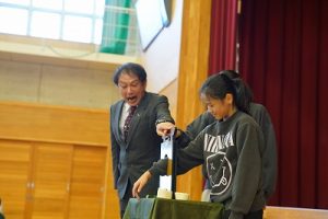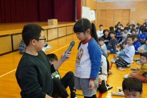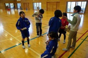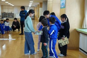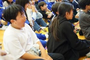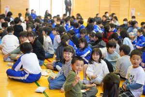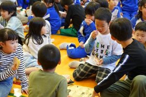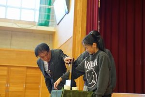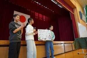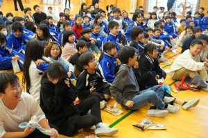 集会の最後には、一人一人にお菓子の詰め合わせが配られました。これには、今年8月、育友会の有志の方々がひみまつりに出店した売上金を使わせていただきました。この日は、大学生(朝日丘小学校の卒業生)も一緒に焼きそばの販売を行いましたが、その売上金も寄付してくれました。ありがたく頂戴し、これからも、子供たちが楽しめる活動に使っていきたいと思います。