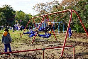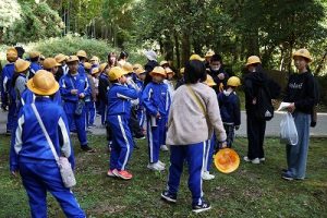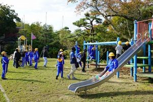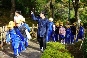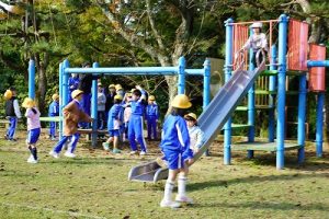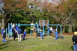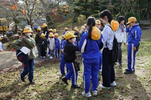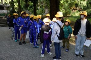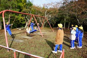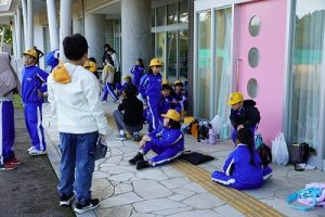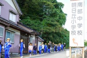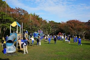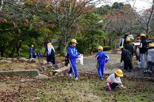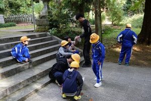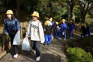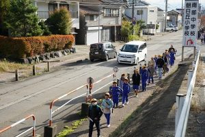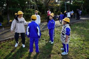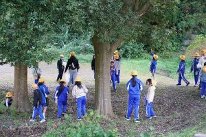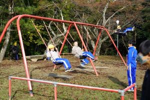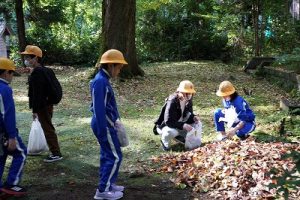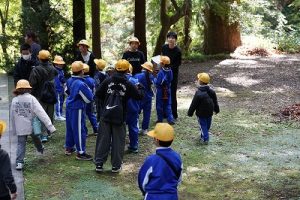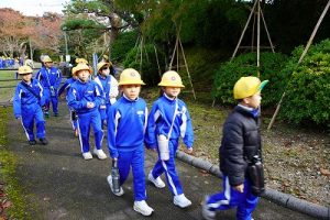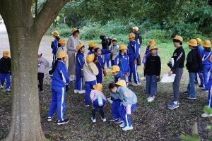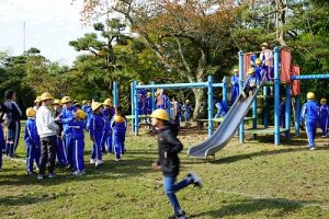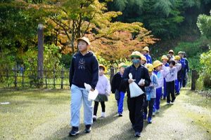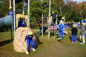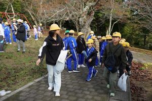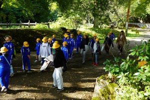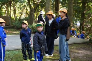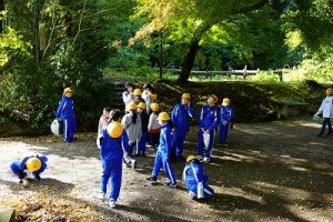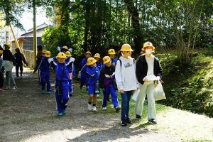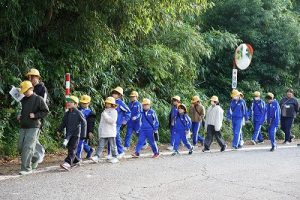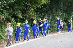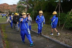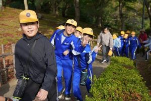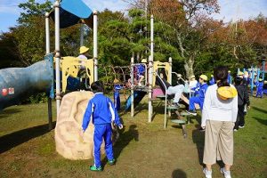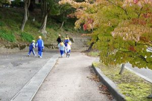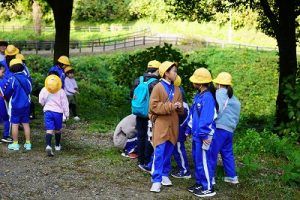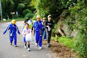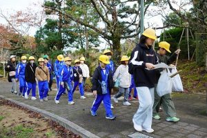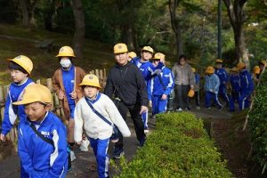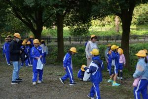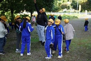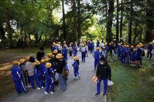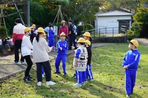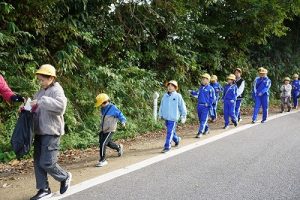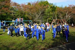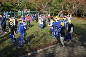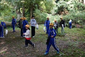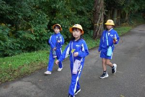 サンライズ集会「秋のウォーキング」が行われました。気持ちのよい秋晴れの中、縦割り班ごとに、朝日山やふれあいの森周辺を散策しました。