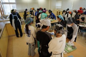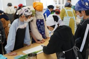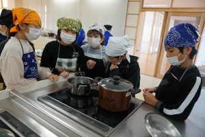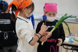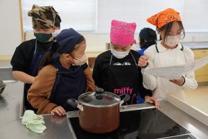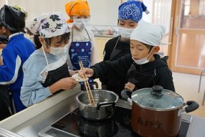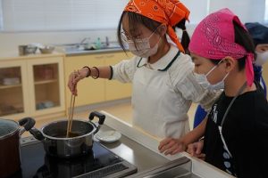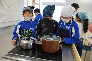 氷見の食材を使った料理教室での調理の様子です。「鍋ご飯」と「すり身の味噌汁」を作っています。グループで協力し合って作業している子どもたちは、とても楽しそうですね。