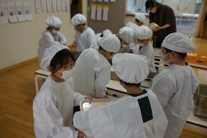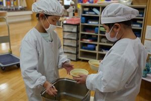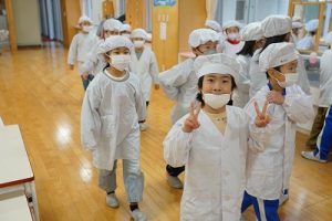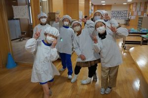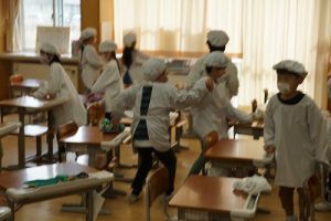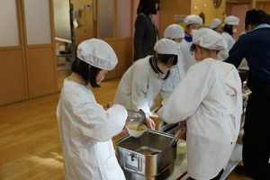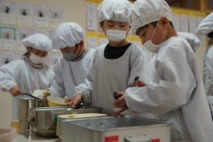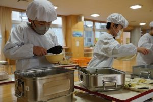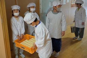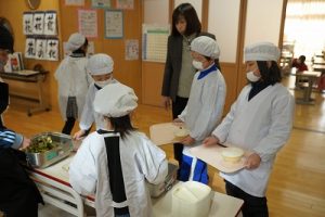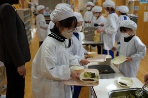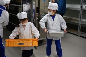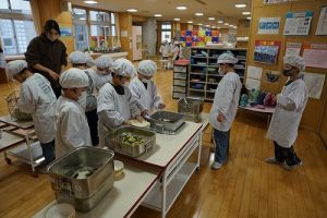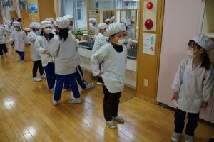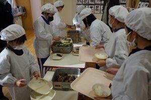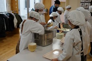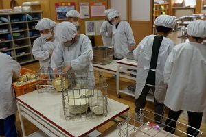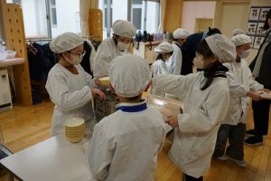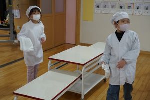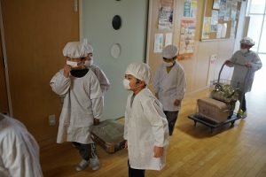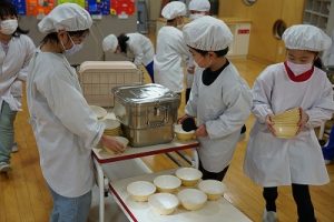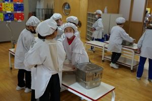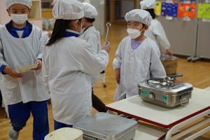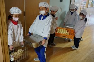 2学期最後の給食です。献立は、「ご飯」「牛乳」「イワシの生姜煮」「キャベツとワカメの甘酢和え」「ピリ辛肉じゃが」です。写真は、1~3年生が、給食の配膳をしている様子です。給食に携わっておられる方々に感謝していただきましょう。
