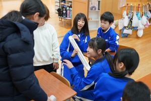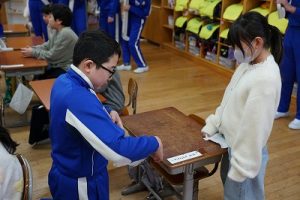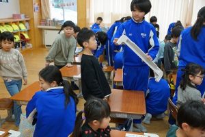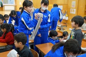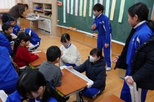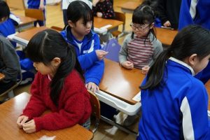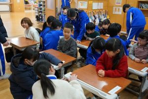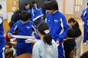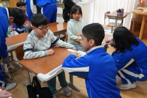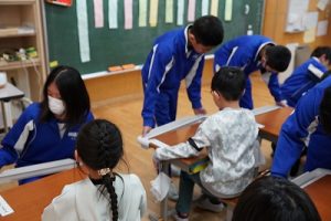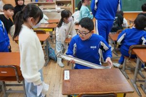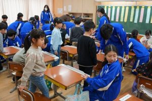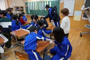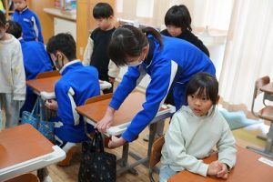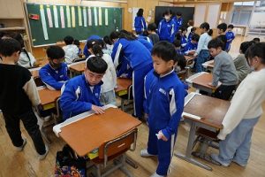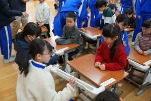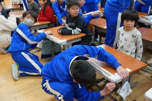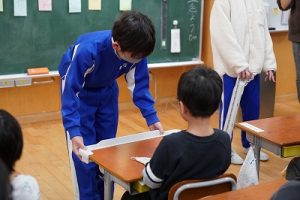 学校では、教科書やノート、筆箱のほかに、タブレットPCも机の上に置いて学習します。そのため、机を広くする器具を取り付けています。1年生は、自分で取り付けること難しいので、6年生が手伝ってくれました。やさしいですね。