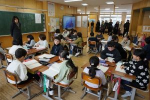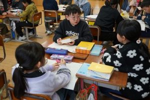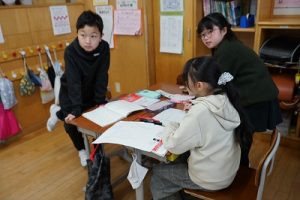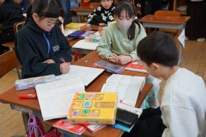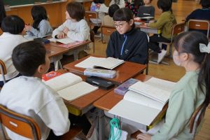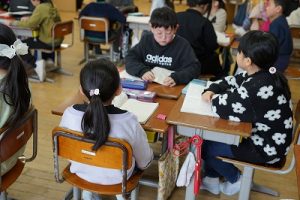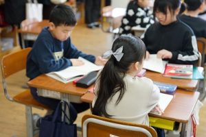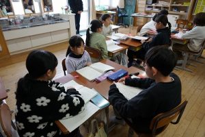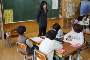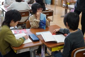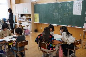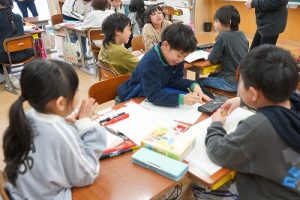 3年生の学習参観は、国語科「カンジーはかせの 音訓かるた」でした。この単元では、これまでに学習した漢字と本単元で扱う漢字の音読みと訓読みを使った言葉を読み、文の中で使うことができるようになることを目指します。今日は、グループごとに、同じ漢字の「音読み」「訓読み」を使った文章を考えていました。