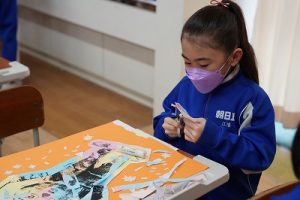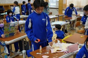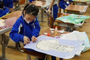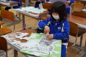 2年生は、版画で印刷した作品を切り取って、色画用紙に貼る作業をしていました。細かい切りくずがたくさん出ましたが、早く終わった人たちが掃き掃除をしてくれました。片付けまでしっかり頑張りましたね。