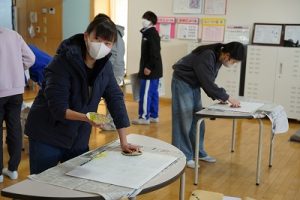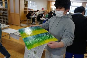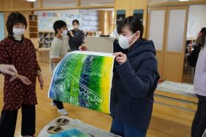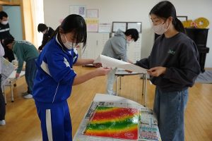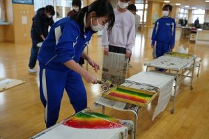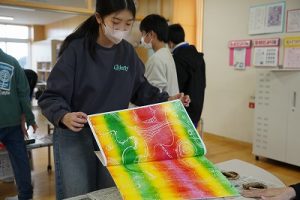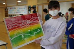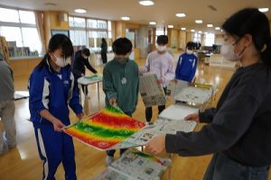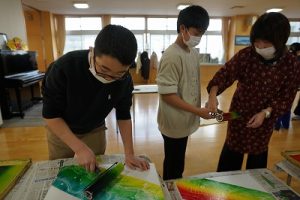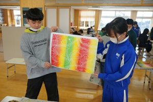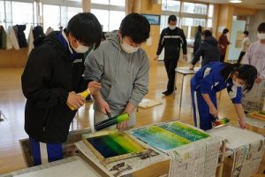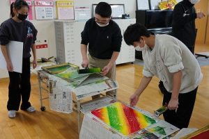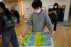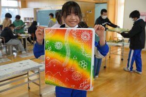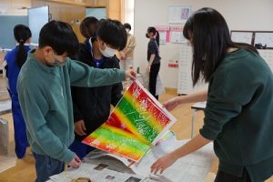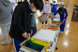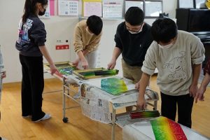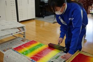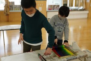 6年生の図画工作科では、スチレン版画の印刷を行っていました。何色かのインクを使って、色の変化を楽しみました。彫った模様がきれいに浮かび上がってすごくきれいな作品になりました。