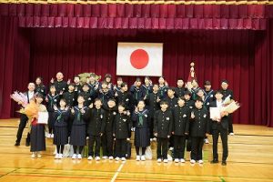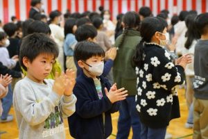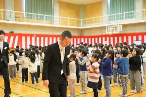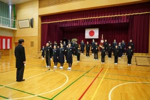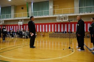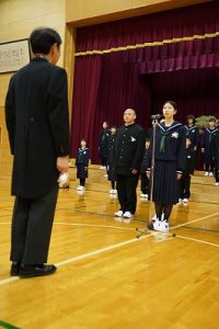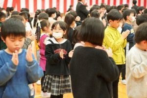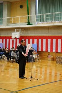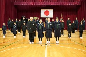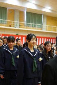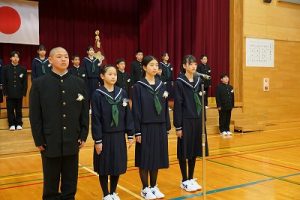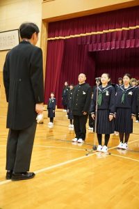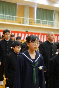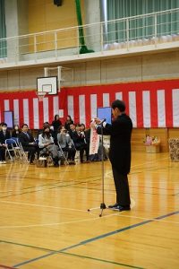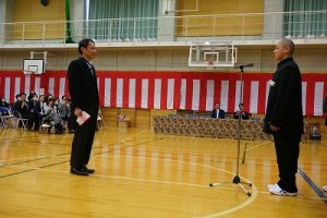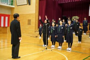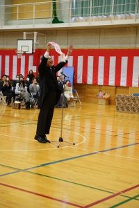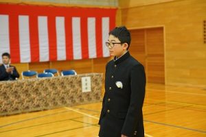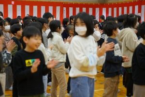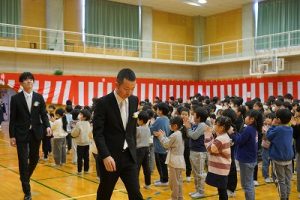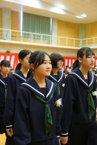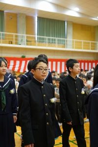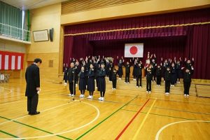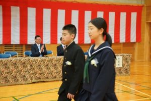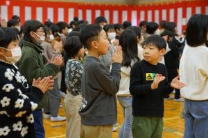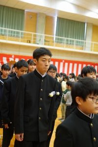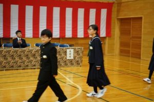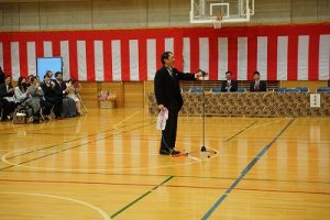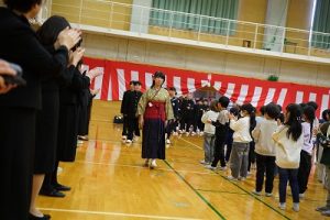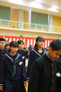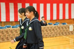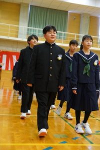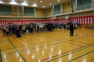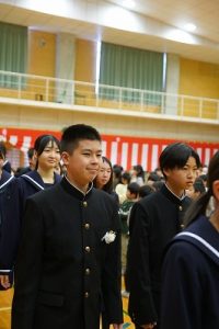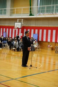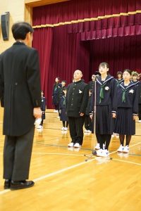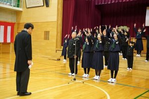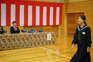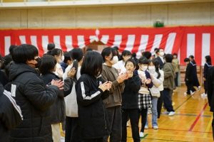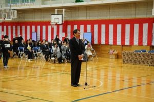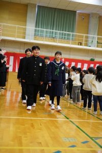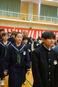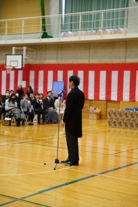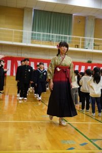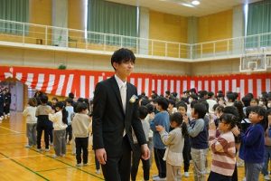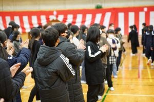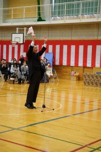 11時30分からは、門出の集いを行いました。小雨の心配があったことや、気温が低かったことから、体育館で実施しました。「卒業生 万歳!」
