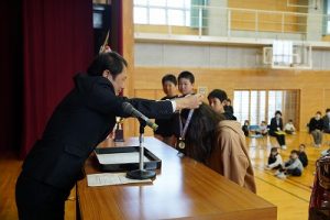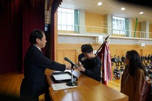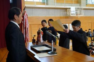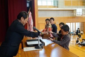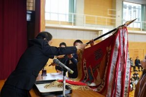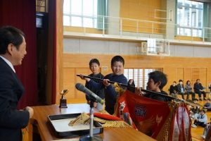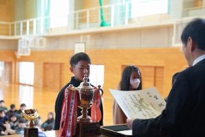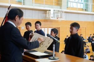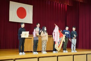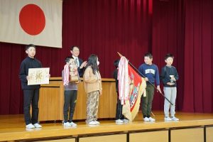 3月24日(火)授賞集会 2026年3月24日 朝日丘っ子 南部Jr野球部が、第33回万葉旗争奪ジュニア野球大会で優勝しました。令和7年度修了式の前に、授賞集会を行い、5年生6名に賞状や優勝旗などを授与しました。おめでとうございます。