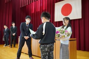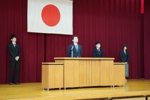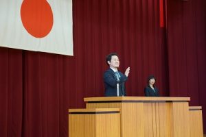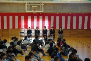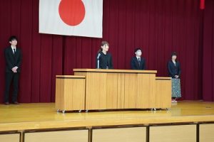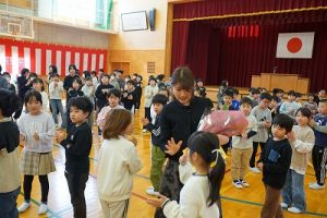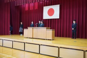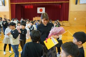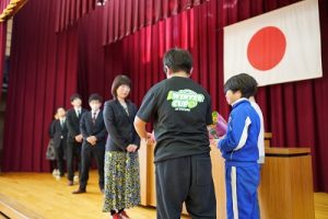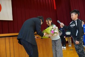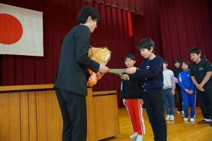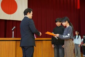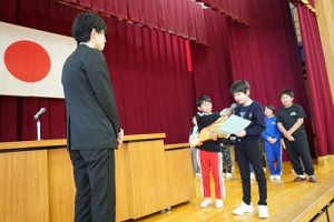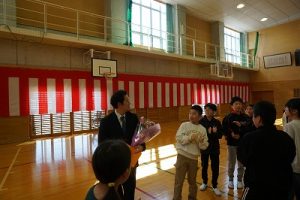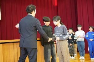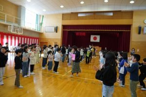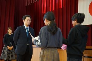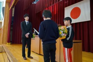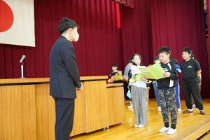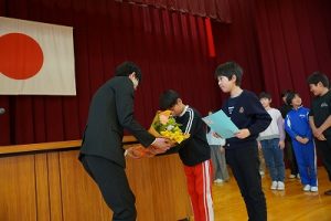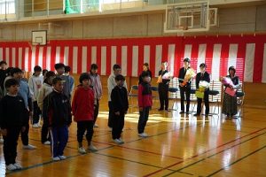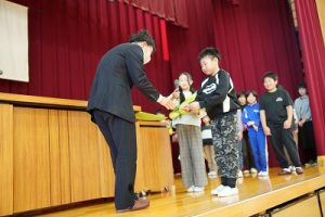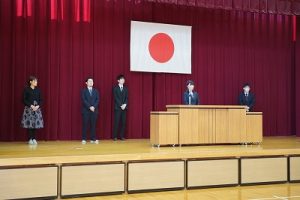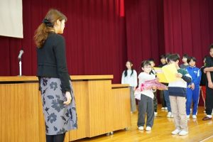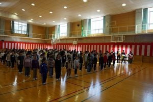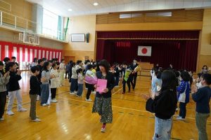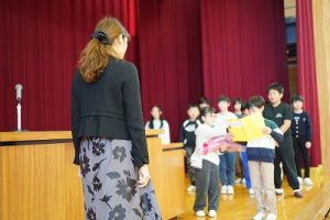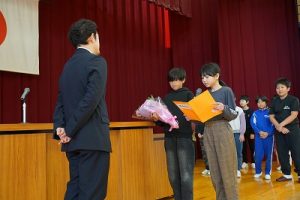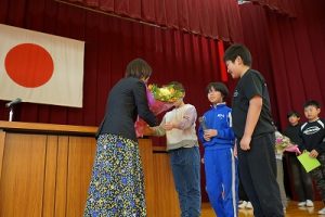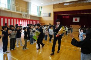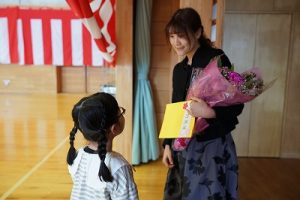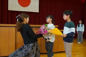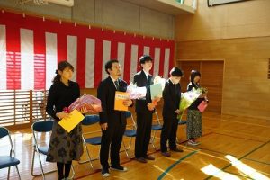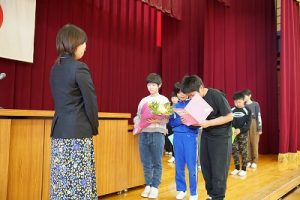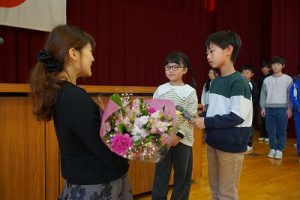 異動された5名の先生方の離任式が行われました。代表の子どもたちが、お礼の言葉を述べ、花束を渡しました。5名の先生方にはたいへんお世話になりました。新天地でも頑張っていただきたく思います。本当にありがとうございました。
