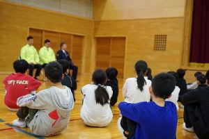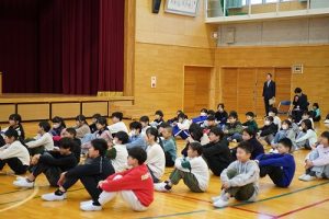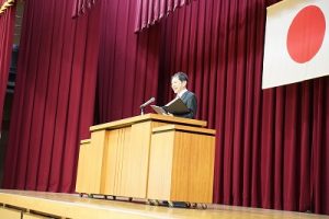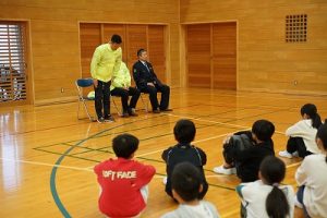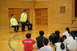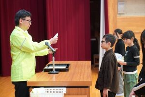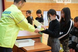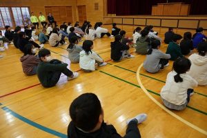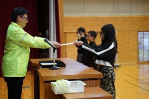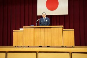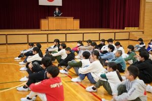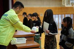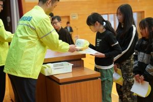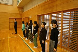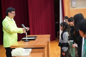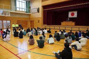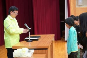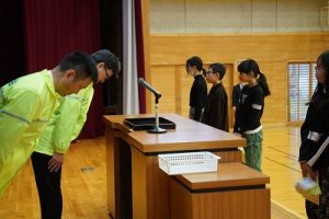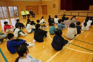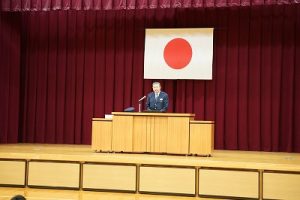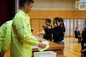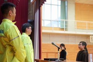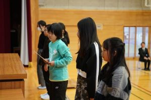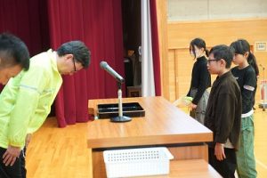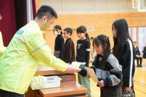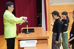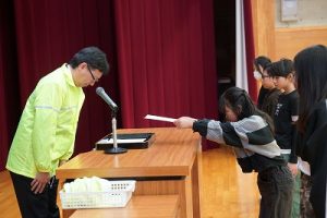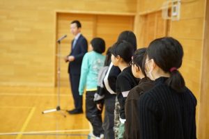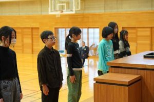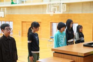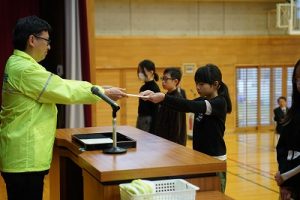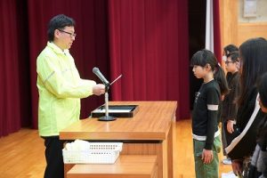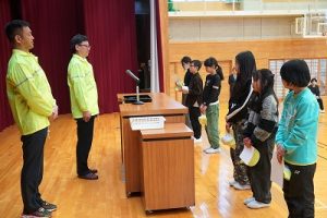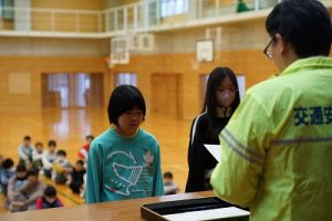 中央交番所長様、交通安全協会朝日丘支部長様、交通安全協会朝日丘事務局長様をお迎えし、少年交通指導員委嘱書交付式が行われました。少年交通指導員の6名に委嘱書が渡されました。また、中央交番所長様からは、「いつもと同じだと安心しないで注意を払ってほしい」とお話していただきました。指導員の6名のいなさん、今年度1年間、どうぞよろしくお願いします。