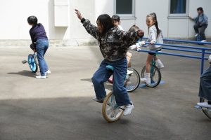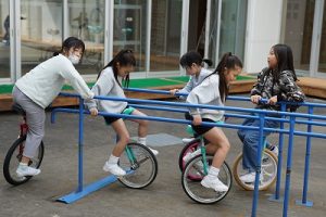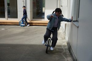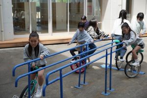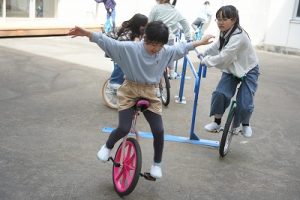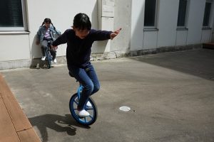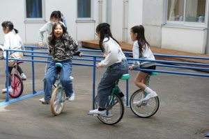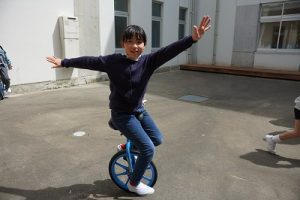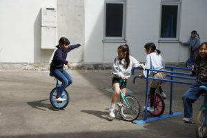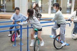 4月14日(火)光庭にて 2026年4月14日 朝日丘っ子 東側(体育館側)の光庭では、一輪車に乗ることが出来ます。昼休みには、一輪車の練習をしている子どもがたくさんいました。ずいぶん上手になってきたようで、長い距離を乗ることができる子どももいました。すごいですね。